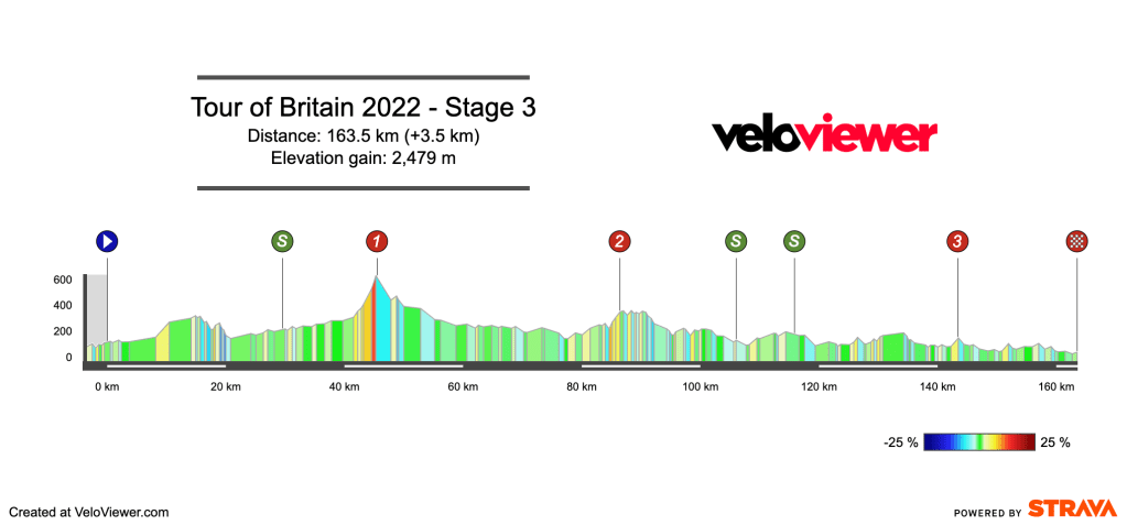 The race moves into England for the third stage of the race. This one looks like a nailed-on sprint, as the cat 1 climb comes very early in the day.