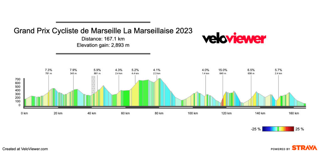 Col de la Gineste is the final climb of the day. It’s steepest at the base of the climb, but the nagging headwind is an issue for those wanting to attack. 10km of descending follows this down to the line in Marseille.