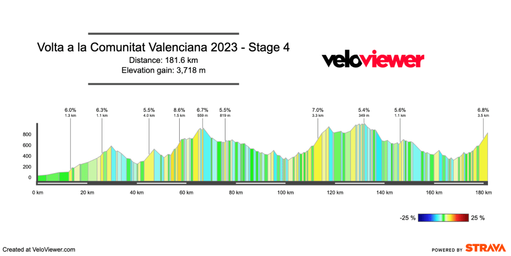 The climb of El Garbí is 2.5km at 10.6% and crests with 30km to go. This is a chance for teams with a strong team to put GC riders under pressure and potentially win the whole race.