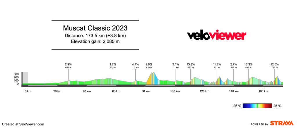 A brand-new race to get your teeth into, it makes sense to have a little warm up before the Tour of Oman kicks off on Saturday. This race has 2086m of climbing, which isn’t that much, but the placement of the climbs means we’re unlikely to get a big sprint. For those that know the Tour of Oman, it’s the same finale that features in the old Al Bustan stage, the one that’s been won by Nathan Haas, Alexey Lutsenko, Ben Hermans and Bob Jungels.