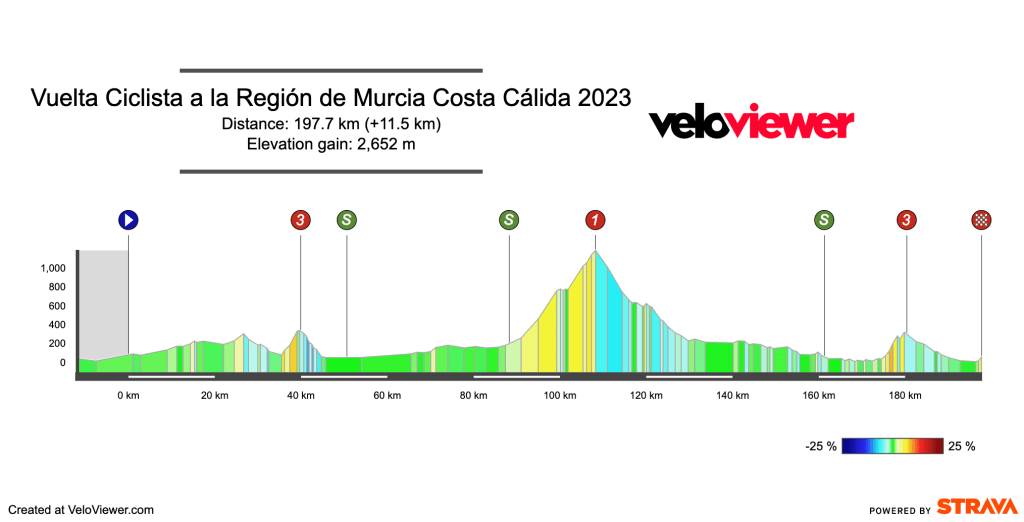 The big climb in the middle of the race. 17.8km at 5.3% and that includes a section of flat in the middle. With a strong tailwind, the best riders will fly up this hill. From the crest there’s 90km to go.