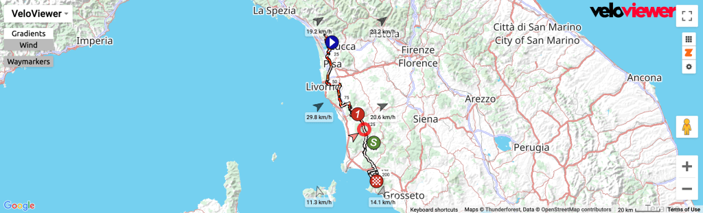 30km/h at the start of the stage will make the bunch nervous. The issue for those wanting to see splits is the wind looks to be cross/headwind to me. Also, this part of the world is full of town, villages, and trees, it’s not Paris-Nice.