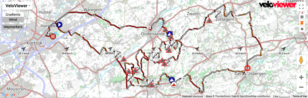 The wind will be around 30km/h for the whole day, which will obviously make the race very hard. You can see there’s lots of crosswinds, but there’s also a substantial amount of headwind, especially as the bunch head towards the Paterberg, which could have a big impact on the race. After the Kwaremont, the run for home is mainly crosswind. Aside from the wind, there’s going to be sun and it shouldn’t feel too cold.