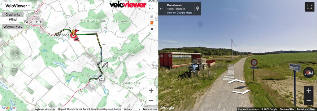 The two cobble sectors are going to be important; the above image is the first one. The road is very narrow, but the cobbles don’t look too bad, and the grass verge also looks fine to be ridden on.