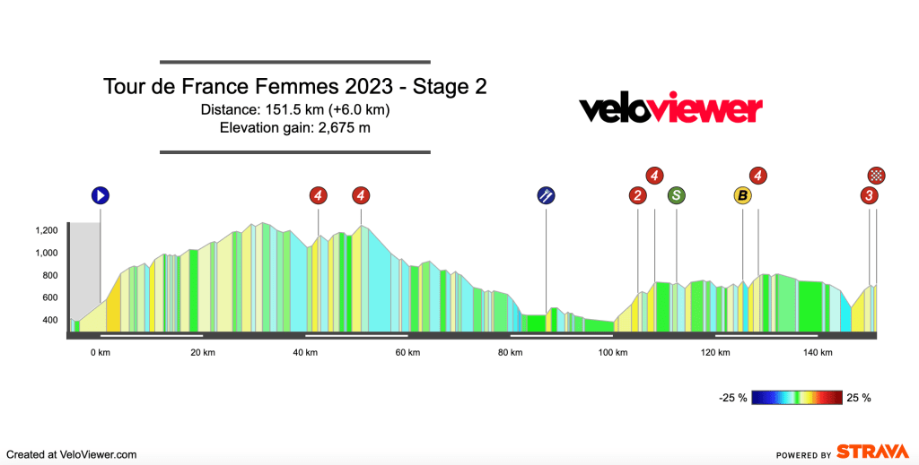 This day has more climbing in it than any other in the race, it might not have a big mountain, but 2675m of climbing over 152km is going to test the legs and should see some gaps on GC.