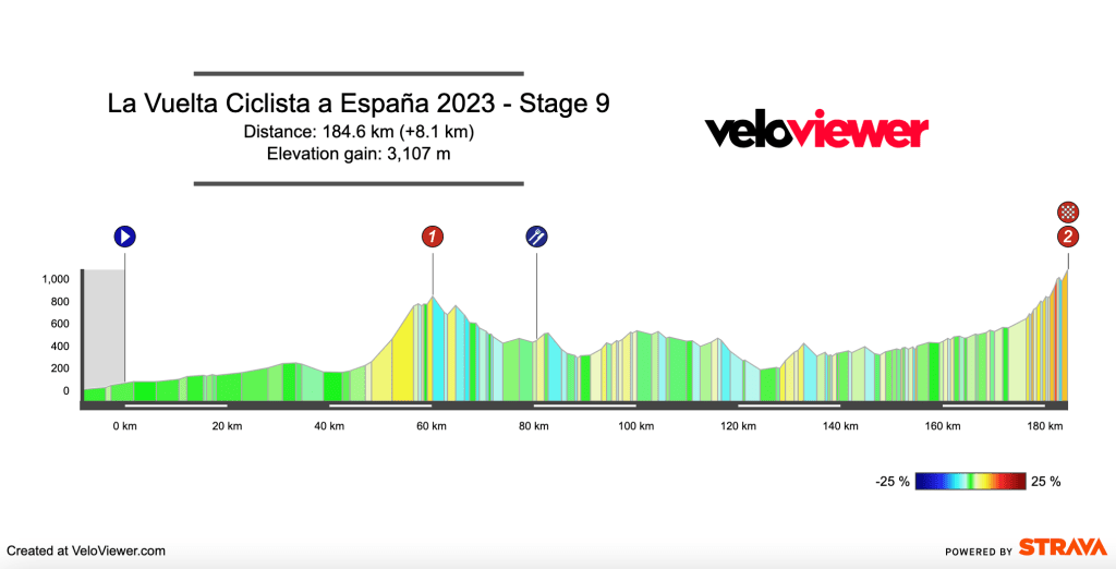 One of the most irregular climbs I’ve seen for a long time. One second, it’s up at 10%, then it’s going downhill, straight into another double-digit section, there’s no time for the riders to settle into a rhythm. The road looks white, common in this part of the world, at times it’s reminiscent of Strade Bianche, but there’s no gravel. I would say the climb is harder than it looks. Inside the final 4km, there’s 1km at over 10% and the final kilometre averages 8%.