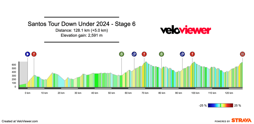 2591m in just 129km, in January, at the end of 6 stage race, I can see why the organisers have stuck with this stage. Last year, Yates, Vine and O’Connor snapped the elastic very close to the finish, with Yates winning the sprint. Just behind them was a group of 15 riders, most finished only 6 seconds behind the winner. In that group was Bryan Coquard, it is possible for a fast man to survive, but they need to be climbing very well.