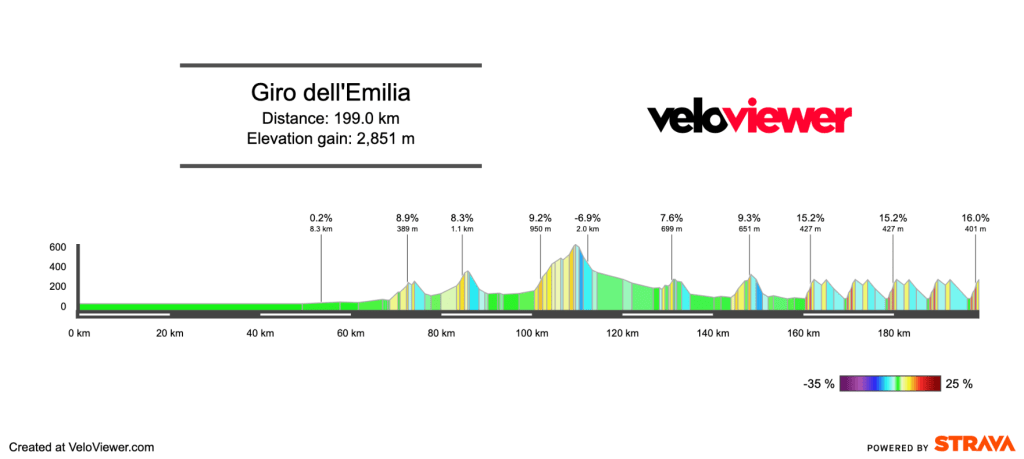Giro dell’Emilia, one of the most beautiful races on the calendar. Back in the day, it was normally raced by smaller teams, but in recent years it’s been full of the biggest names in cycling. This year, the Euros have stolen several of the top European talents, but the start list still looks strong to me. The organisers of the race always tinker with the first section of the race, mainly due to switching the start town on a regular basis. This year, they’ve gone for an easier approach to San Luca, followed by 5 ascents of the beautiful climb.